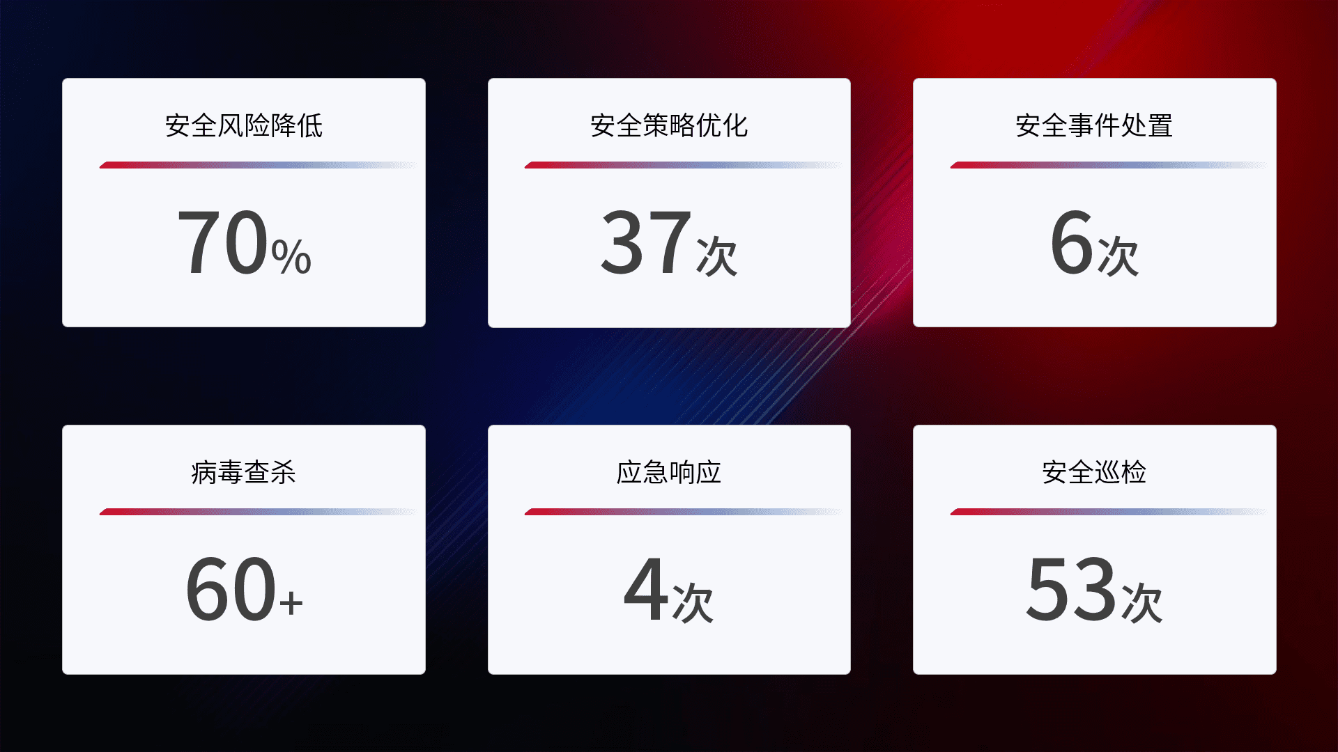 提供全面的安全事件报告体系,,,,包括处置报告、、、、周报、、、季度和年度总结,,结合持续监控,,,,帮助客户深入了解网络安全状况。。。