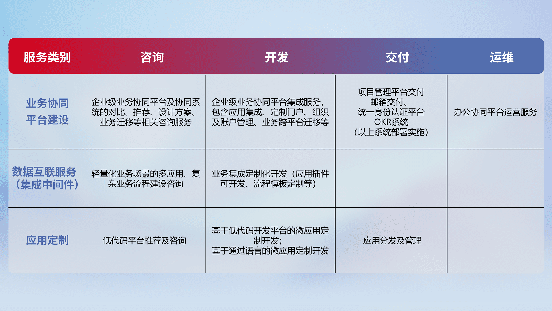针对钉钉、、、企微、、、IDaas等平台级产品提供产品的规划、、、方案、、、交付、、、、定制化开发等服务,,,,实现如统一协同办公、、智能客户服务、、混合会议管理、、、智能数据查询、、、等业务场景,,,,实现数字化转型。。。。